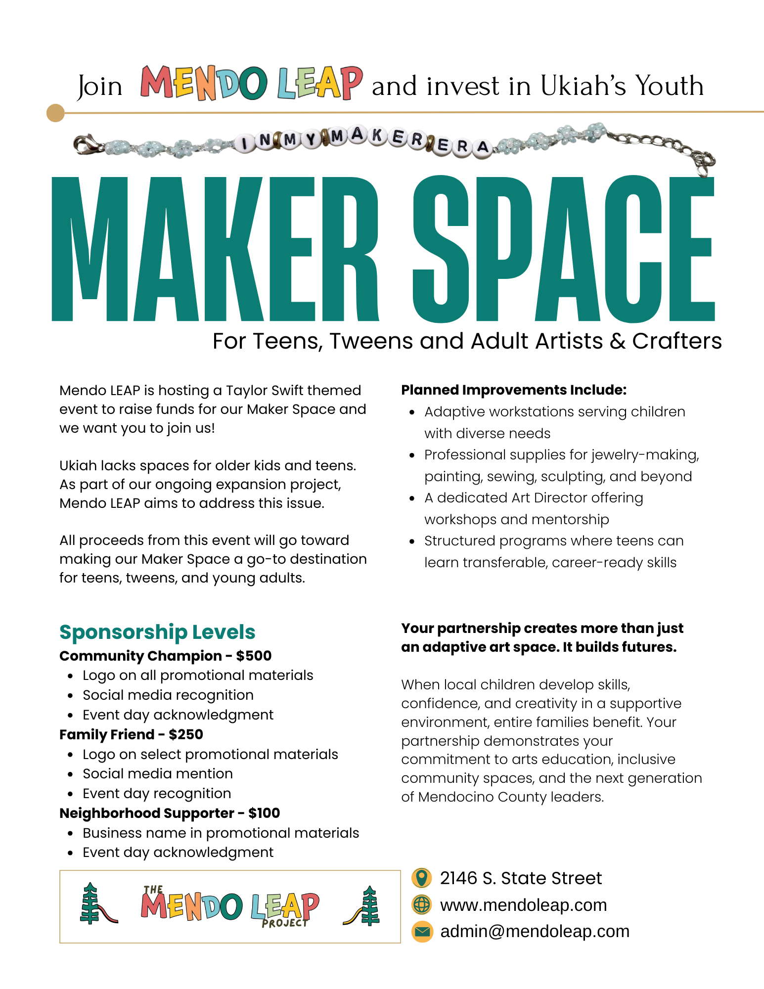 Makers Space classes are led by local artist and Mendo LEAP Art Director Portia Schneider. She has a Bachelor of Fine Arts with an emphasis in Photography and a minor in Art History. She has also been formally taught in print-making, sculpture and photography. Portia has photographed in Australia, Canada, Egypt, France, Italy, Jamaica, Mexico, Panama, South Africa, Spain, and various locations in The United States of America.