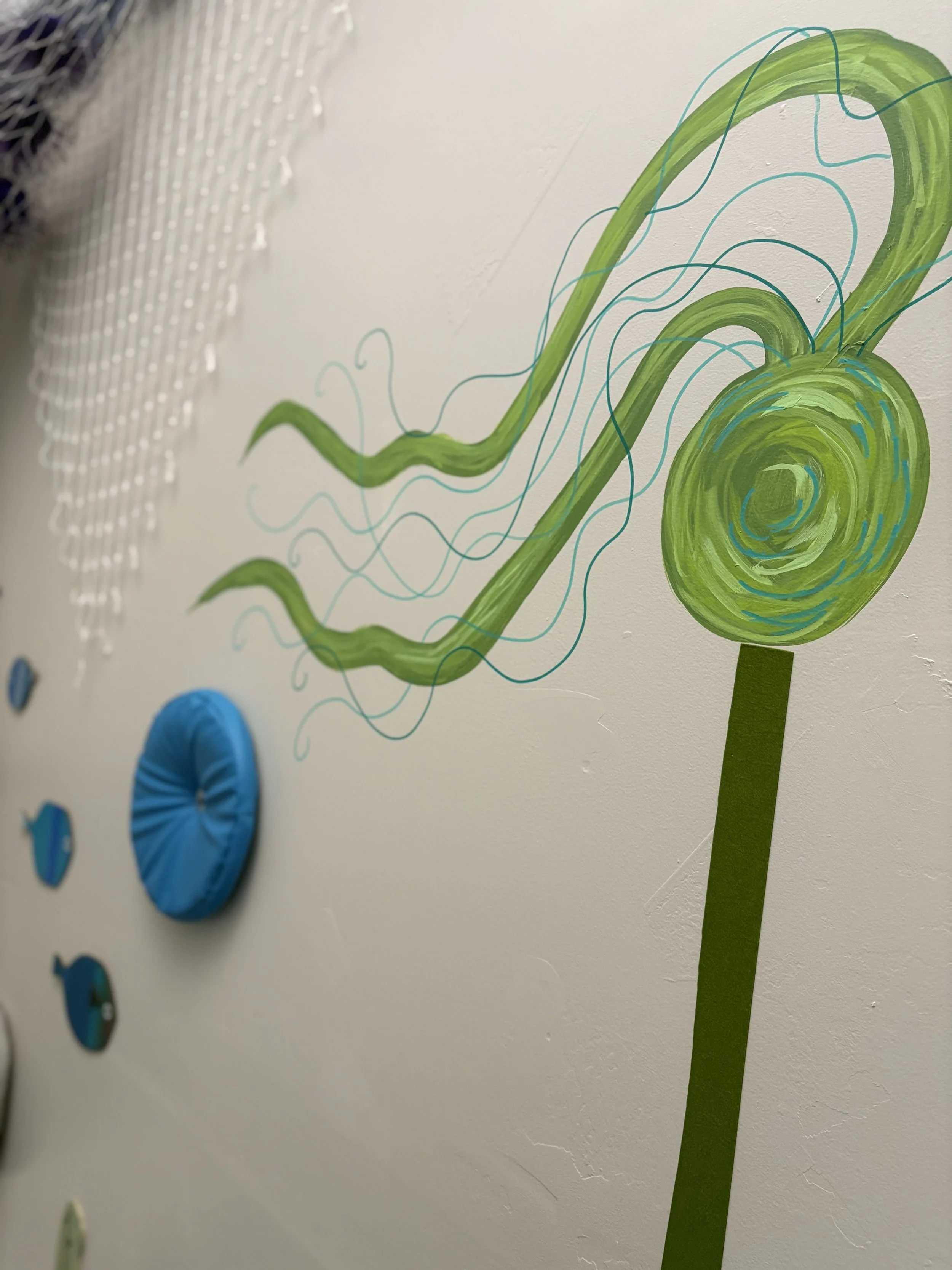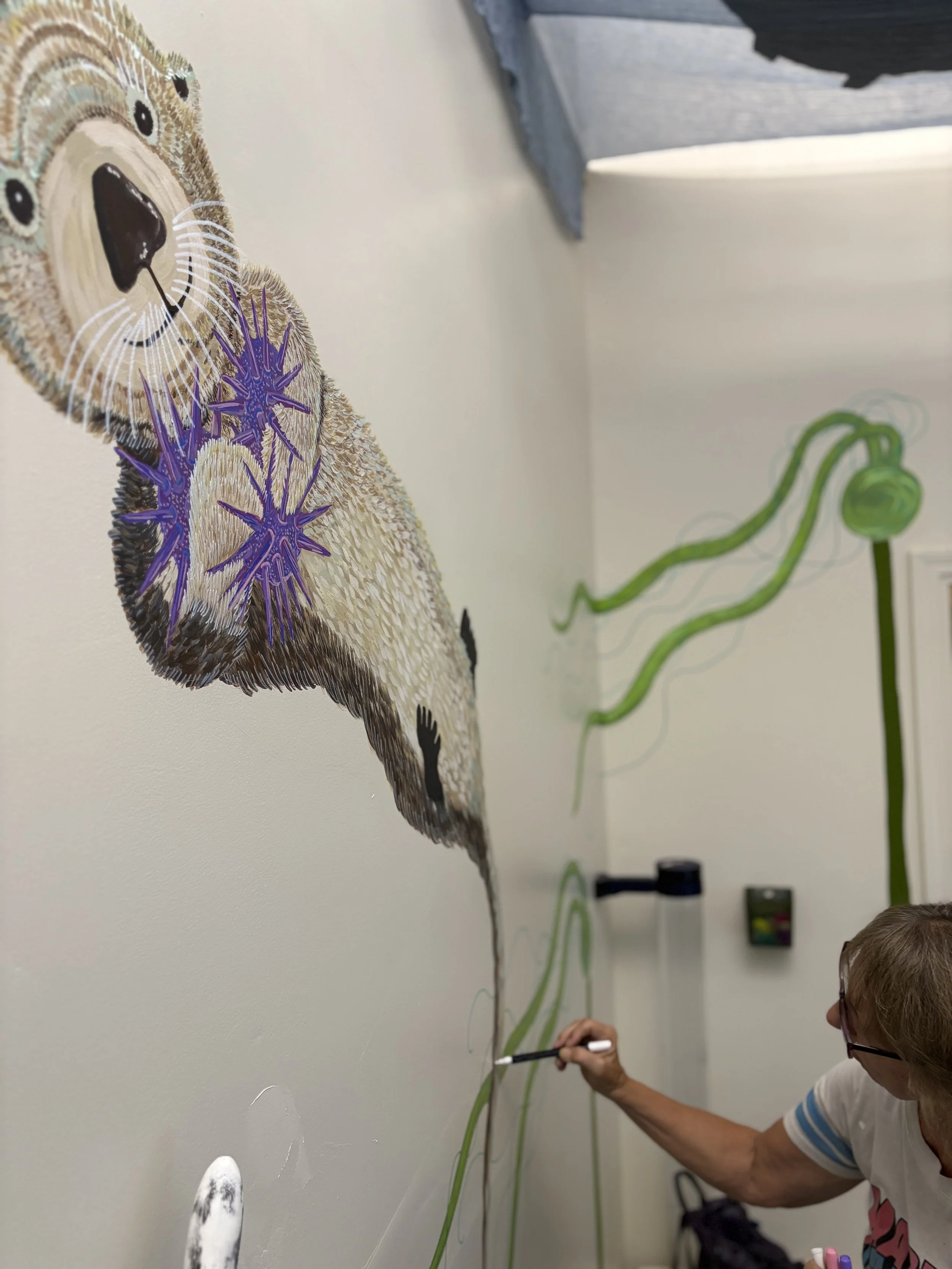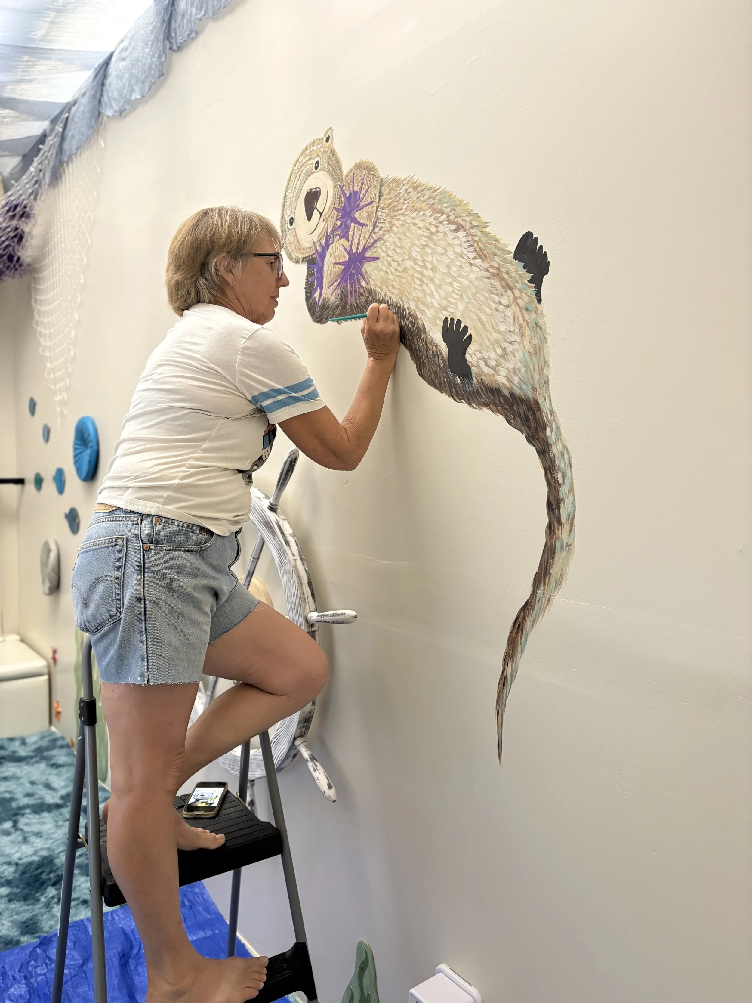 Her mural, a joyful depiction of a sea otter enjoying some tasty purple sea urchins amidst soft kelp and ocean bubbles, now graces the wall of our sensory room welcoming children and adults alike into a space of calm, wonder, and connection.